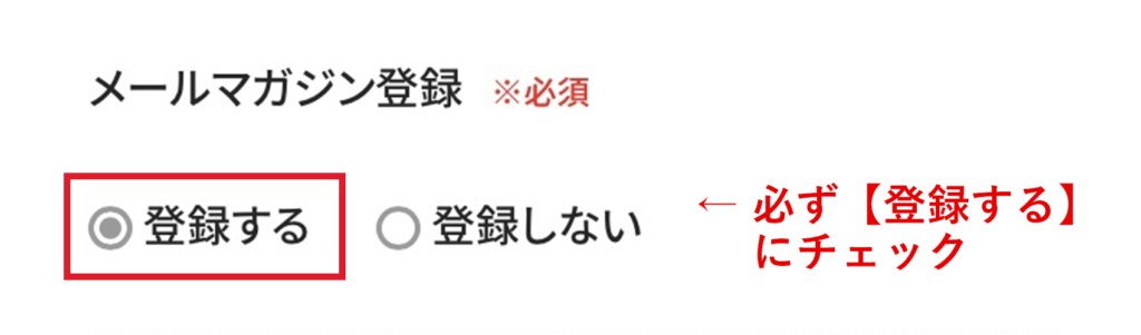 メルマガ登録は、ギフト券1500円もらえる条件なので、必ず「登録する」を選択。