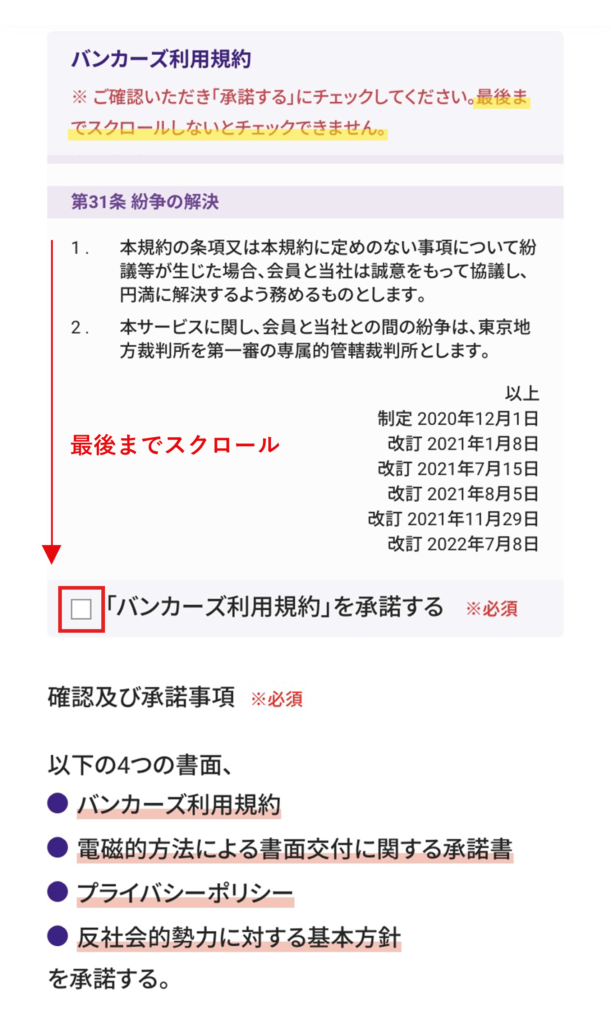 利用規約を最後までスクロールして、「承諾する」にチェックを入れましょう。