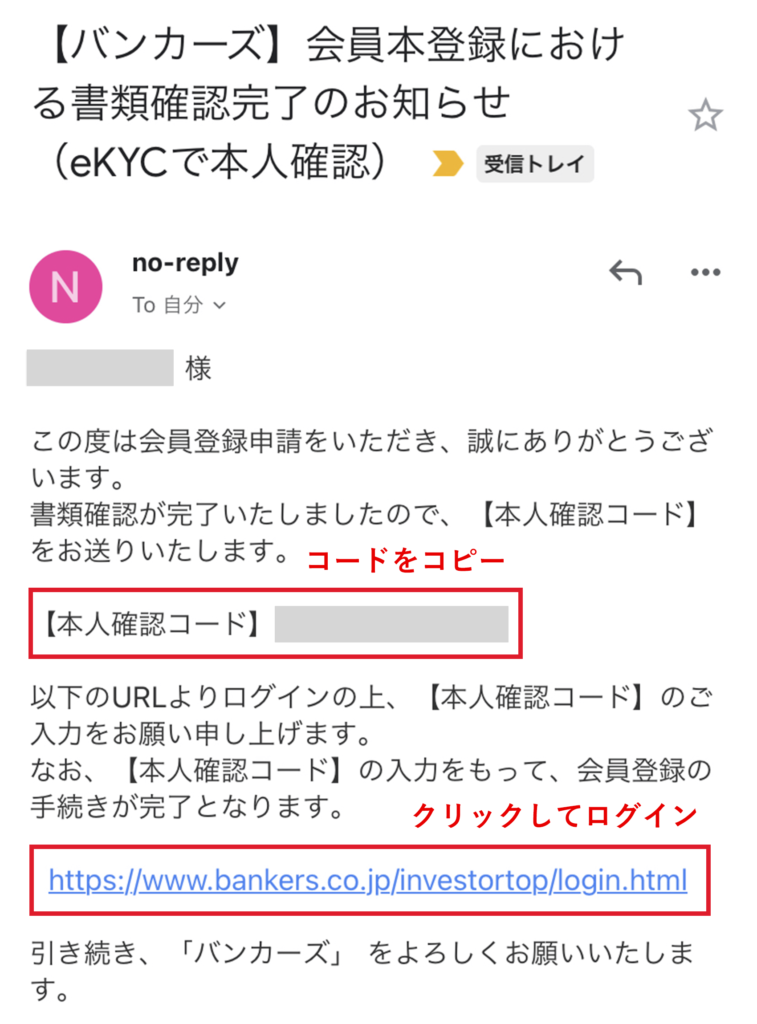 本人確認コードをコピー→URLをクリックしてログインしましょう。
