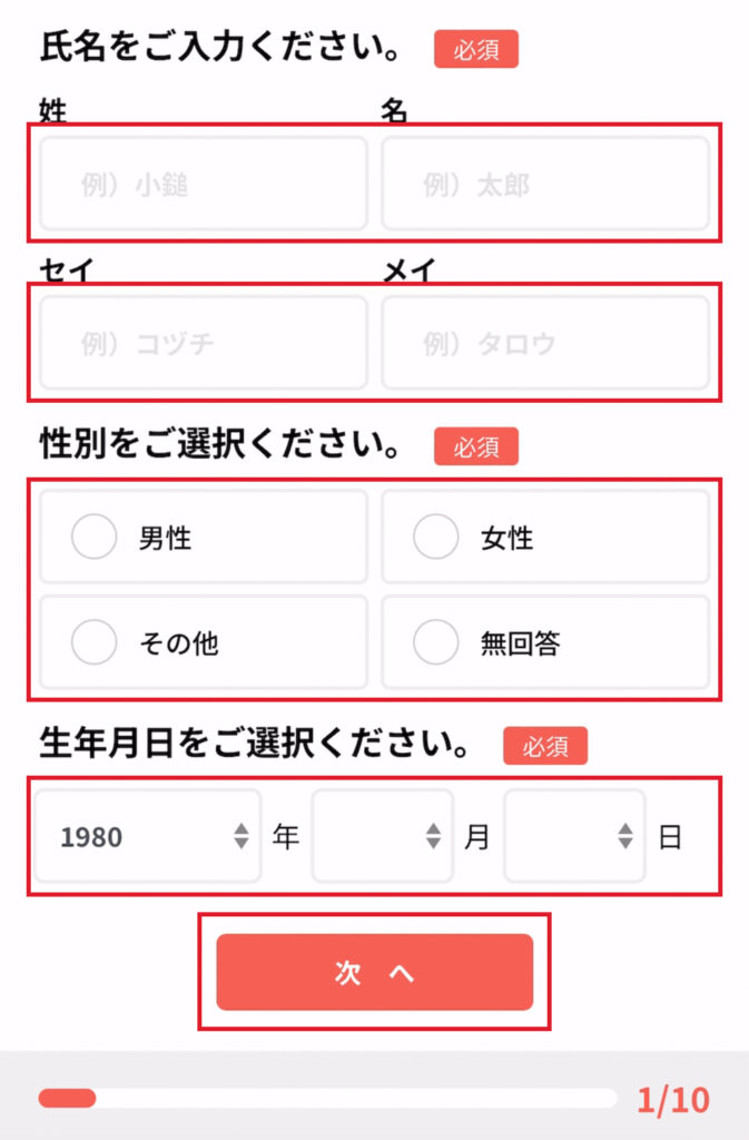 下記の画面が表示されるので、それぞれの必須項目を記入していきます。
