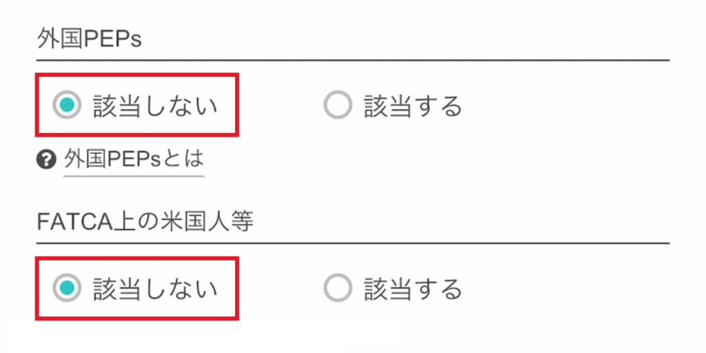 【外国PEPs】【FATCA上の米国人等】は「該当しない」にチェックを入れましょう◎