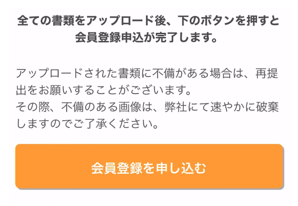 提出書類のアップロードが完了すると、【会員登録を申し込む】のボタンが、グレーからオレンジ色に変わるので、タップしましょう!