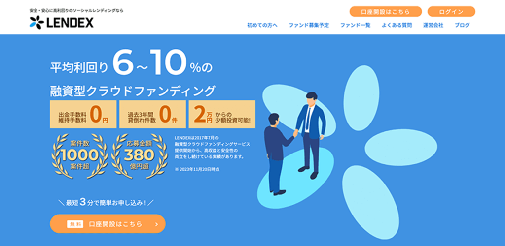 LENDEX(レンデックス)は、不動産関連のファンドを主に取り扱うソーシャルレンディングのプラットフォームです。