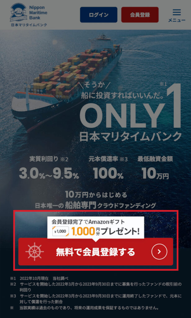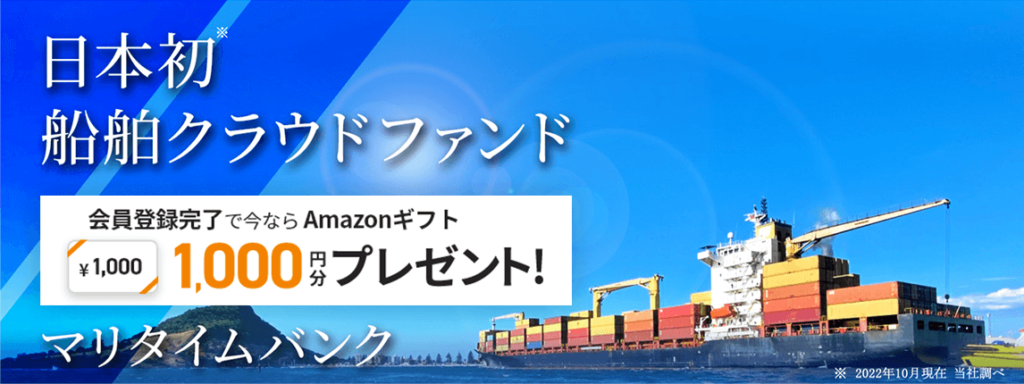 『Maritime Bank(マリタイムバンク)』で最短5分の投資家登録すると、今なら誰でも1,000円分のAmazonギフトがもらえます。