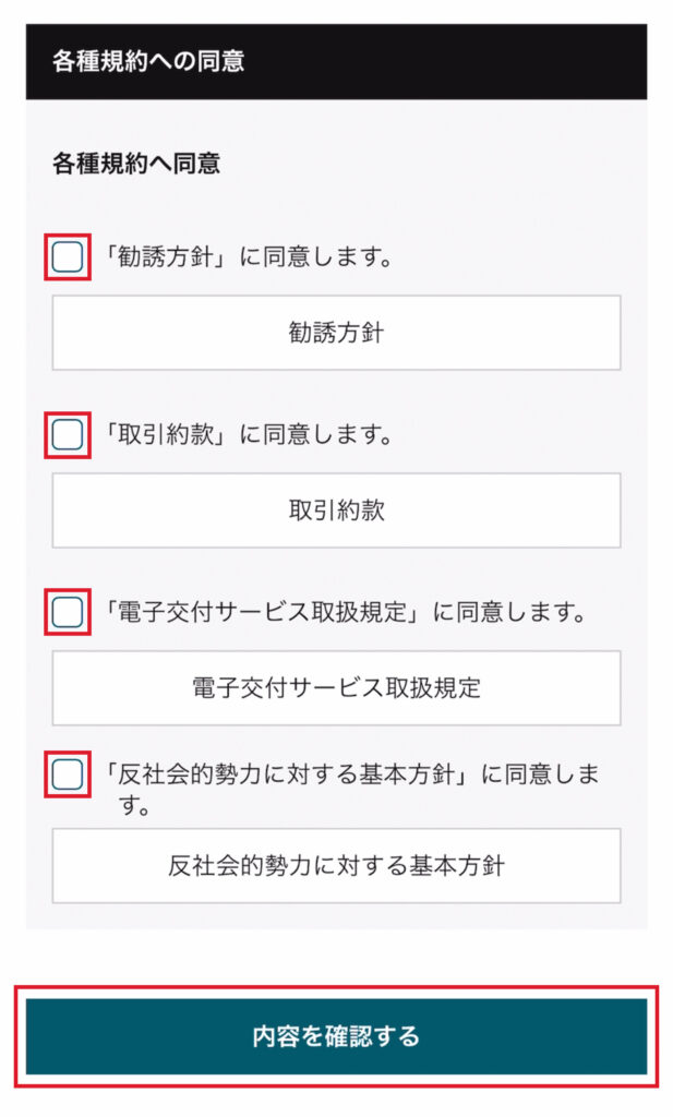 各種規約への同意を4つチェックし、完了ボタンをクリックする。