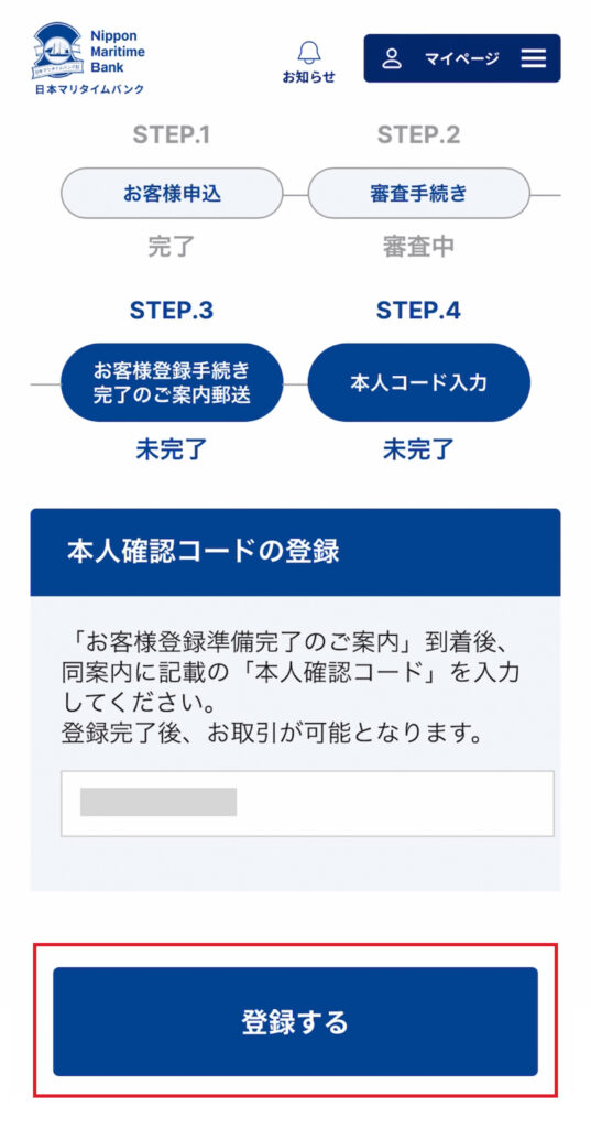 - マイページにログインし、本人確認コードを入力する