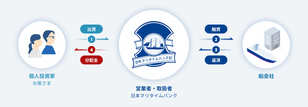 個人の投資家からWeb上で資金を集め、その資金をもとに船会社に融資し、その返済利息の一部を分配金として還元されます。