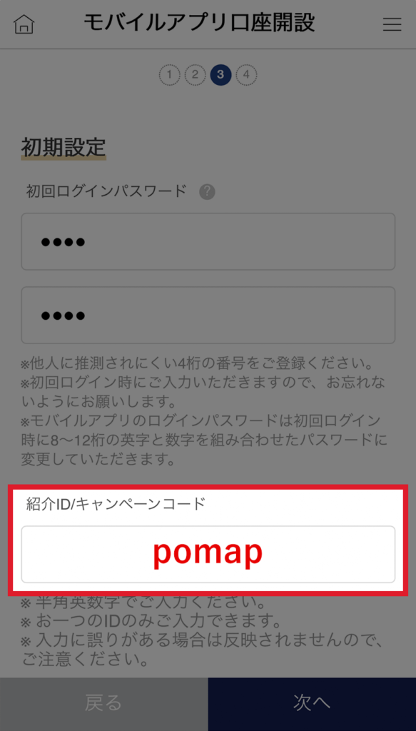 メールアドレス認証などを終えると「ログインパスワード設定画面」で「紹介ID/キャンペーンコード」入力欄が出てきます。