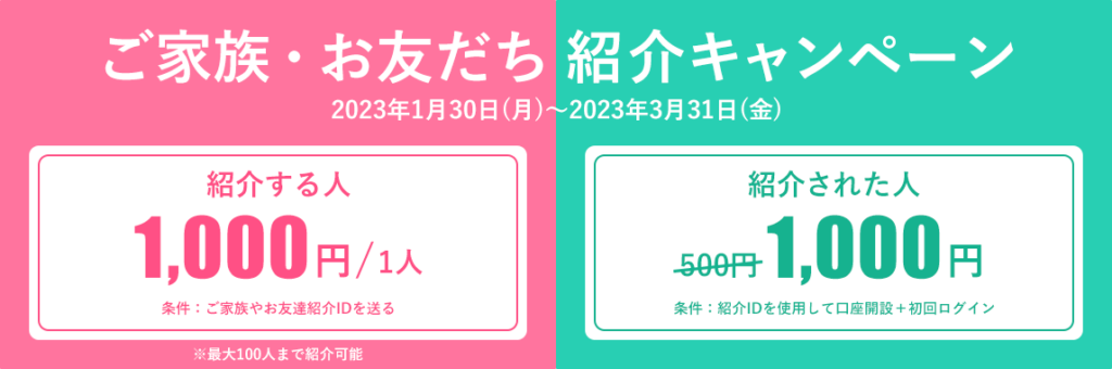 この記事を読むと、今日だけで「自分の口座開設で1,000円」と「知人への紹介で1,000円」の最低でも2,000円以上はお金をもらえます◎